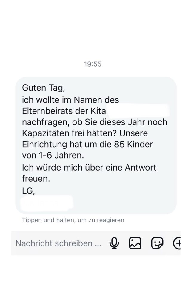 Ihr schreibt mir einfach über das Kontaktformular eure Anfrage. Alternativ könnt ihr mir auch eine E-Mail, per Instagram oder per Whatsapp schreiben. Anschließend können wir telefonieren oder videochatten um die Eckdaten abzustecken. An einem gemeinsam festgelegten Termin komme ich in der Einrichtung vorbei und schaue mir an, was vor Ort alles möglich wäre. Die Leitung und/oder der Elternbeirat können hierbei noch ihre Fragen und Wünsche los werden.